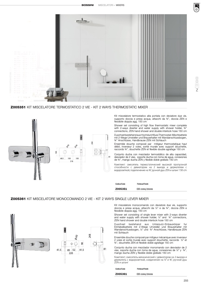 doccia e presa acqua, attacchi da 1⁄2” e da 3⁄4”, doccia ZEN e