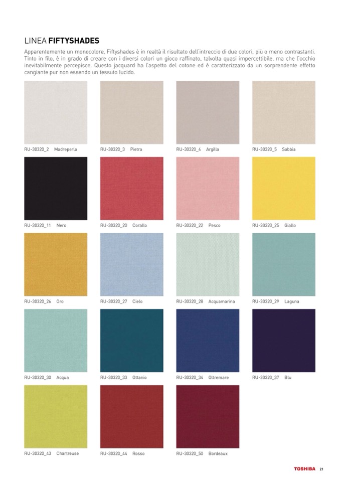 Apparentemente un monocolore, Fiftyshades è in realtà il risultato dell’intreccio di due colori, più o meno contrastanti.