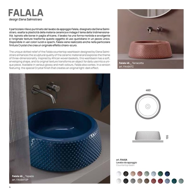 Disponibile in vari colori lucidi e opachi, Falala viene realizzato anche nella particolare