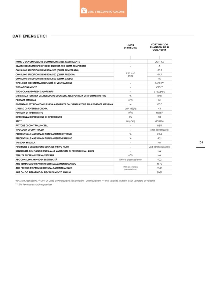 * NA: Non Applicabile. ** UVR-U: Unità di Ventilazione Residenziale - Unidirezionale. *** VM: Velocità Multiple. VSD: Variatore di Velocità.