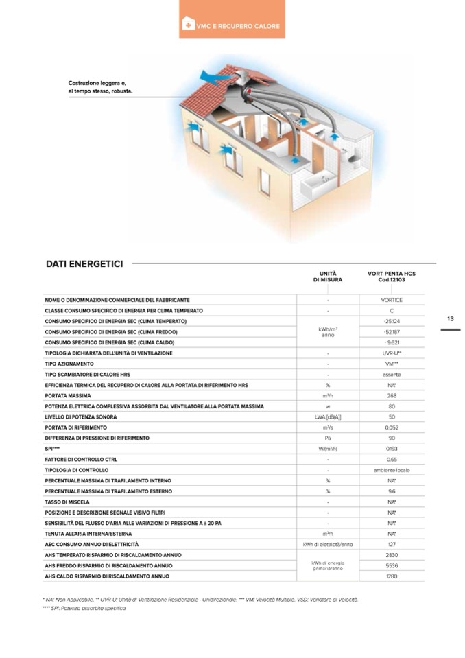 * NA: Non Applicabile. ** UVR-U: Unità di Ventilazione Residenziale - Unidirezionale. *** VM: Velocità Multiple. VSD: Variatore di Velocit
