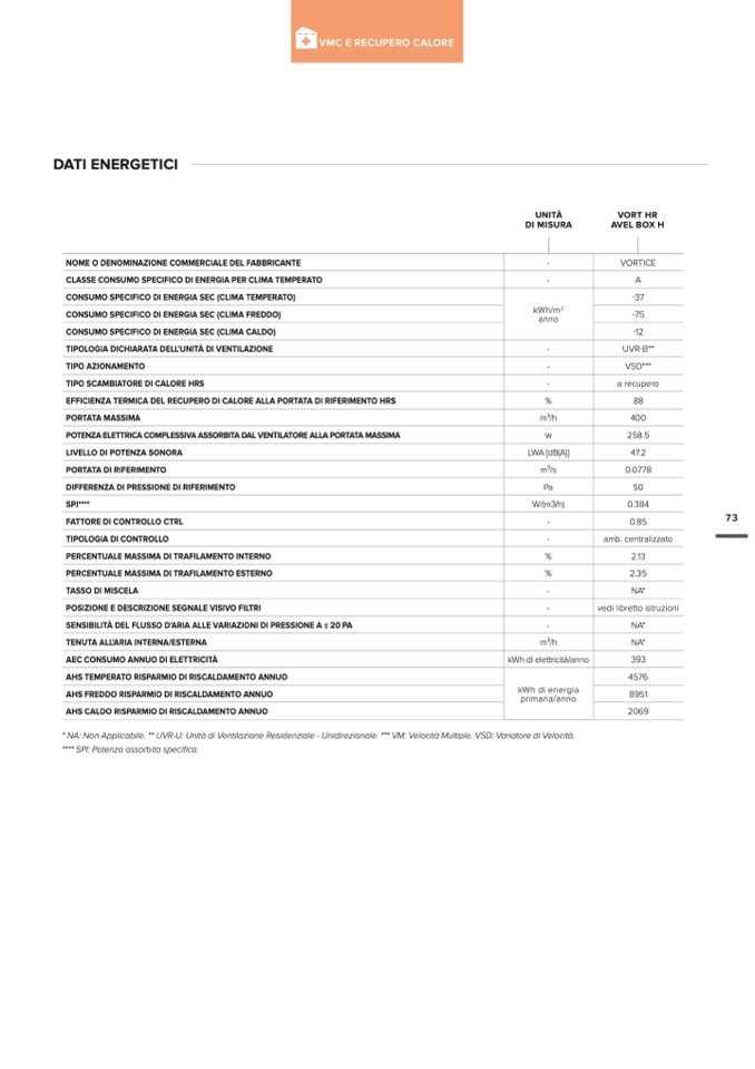 * NA: Non Applicabile. ** UVR-U: Unità di Ventilazione Residenziale - Unidirezionale. *** VM: Velocità Multiple. VSD: Variatore di Velocità.