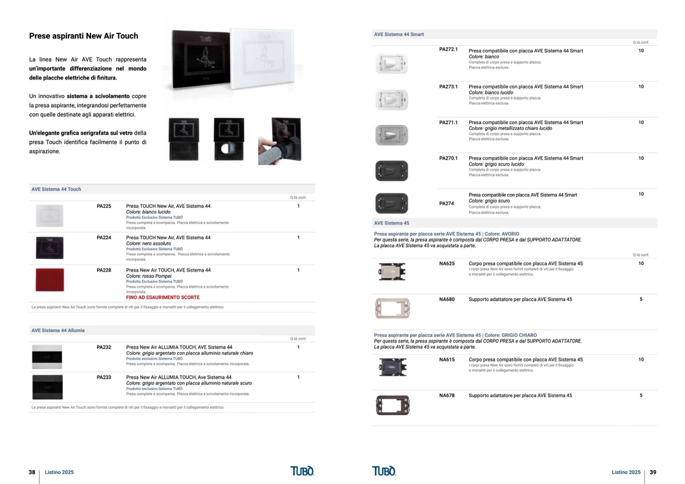 Le prese aspiranti New Air Touch sono fornite complete di viti per il 昀椀ssaggio e morsetti per il collegamento elettrico
