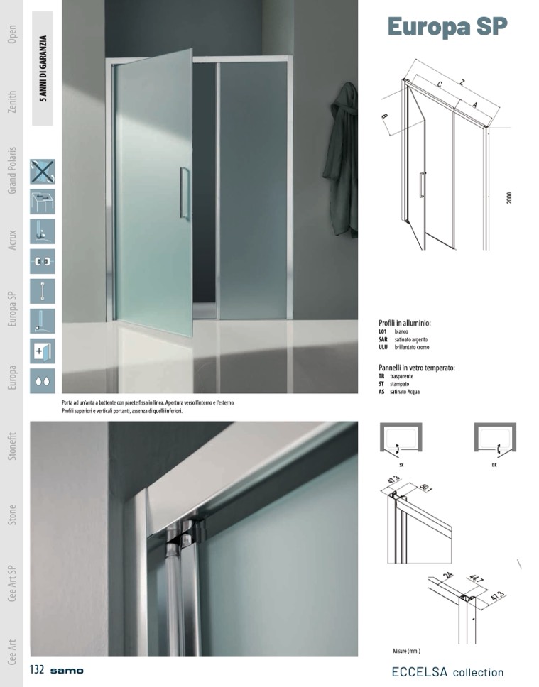 Porta ad un’anta a battente con parete fissa in linea. Apertura verso l’interno e l’esterno.