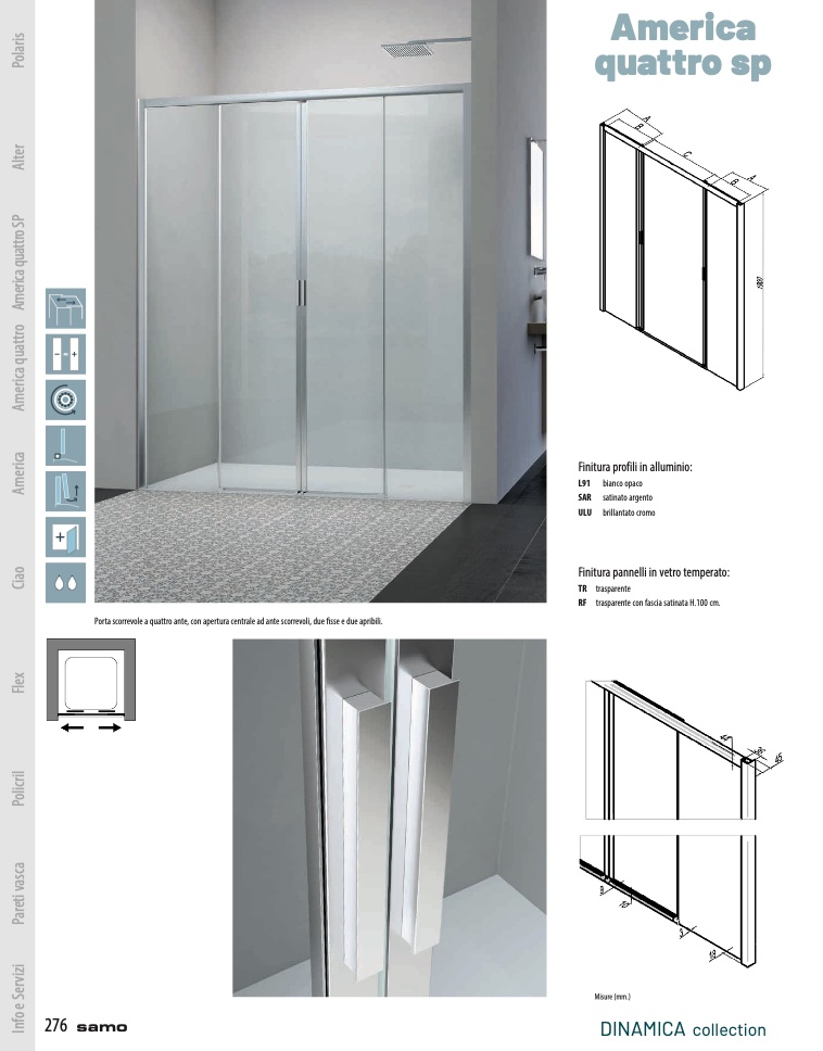 Porta scorrevole a quattro ante, con apertura centrale ad ante scorrevoli, due fisse e due apribili.