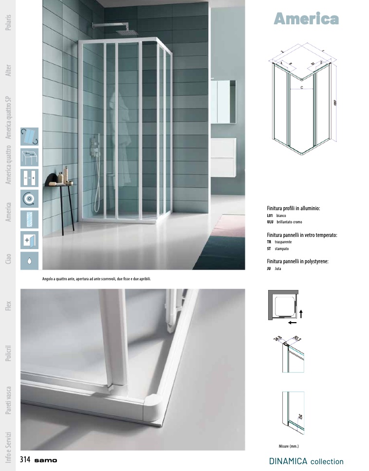 Angolo a quattro ante, apertura ad ante scorrevoli, due fisse e due apribili.