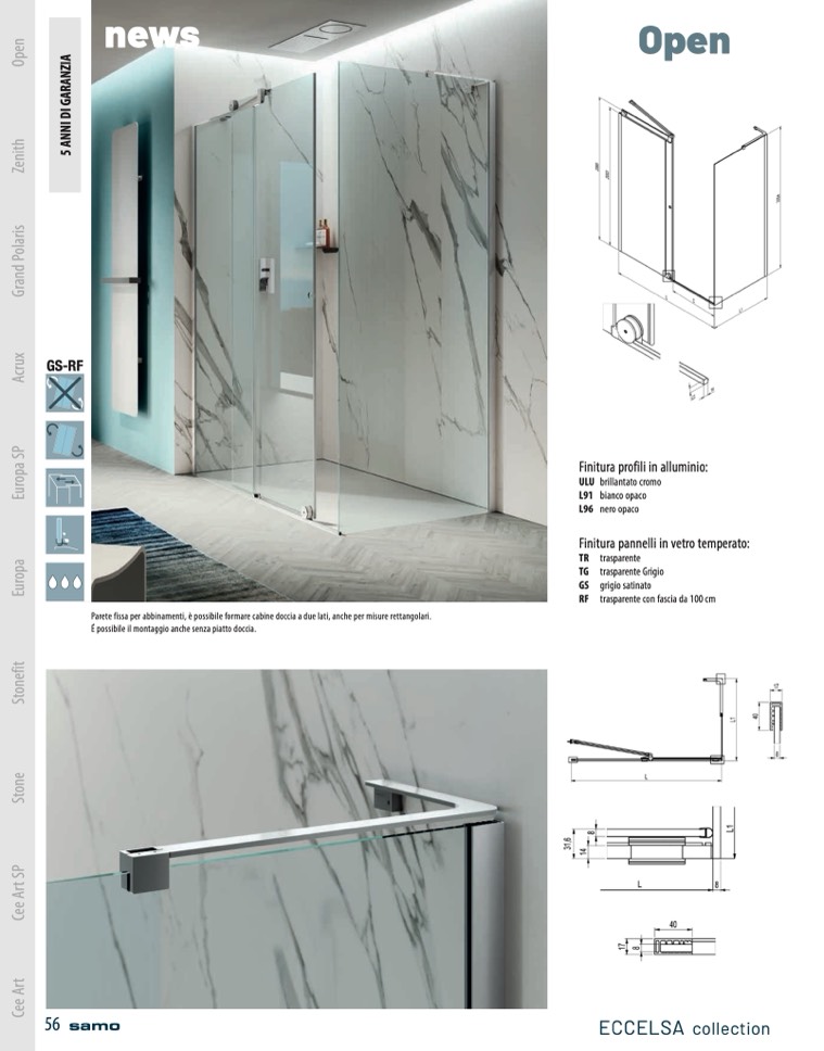 Parete fissa per abbinamenti, è possibile formare cabine doccia a due lati, anche per misure rettangolari.