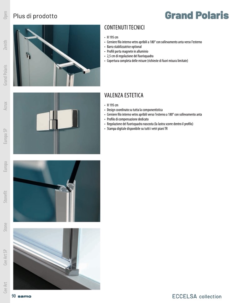 • Cerniere filo interno vetro apribili a 180° con sollevamento anta verso l'esterno
