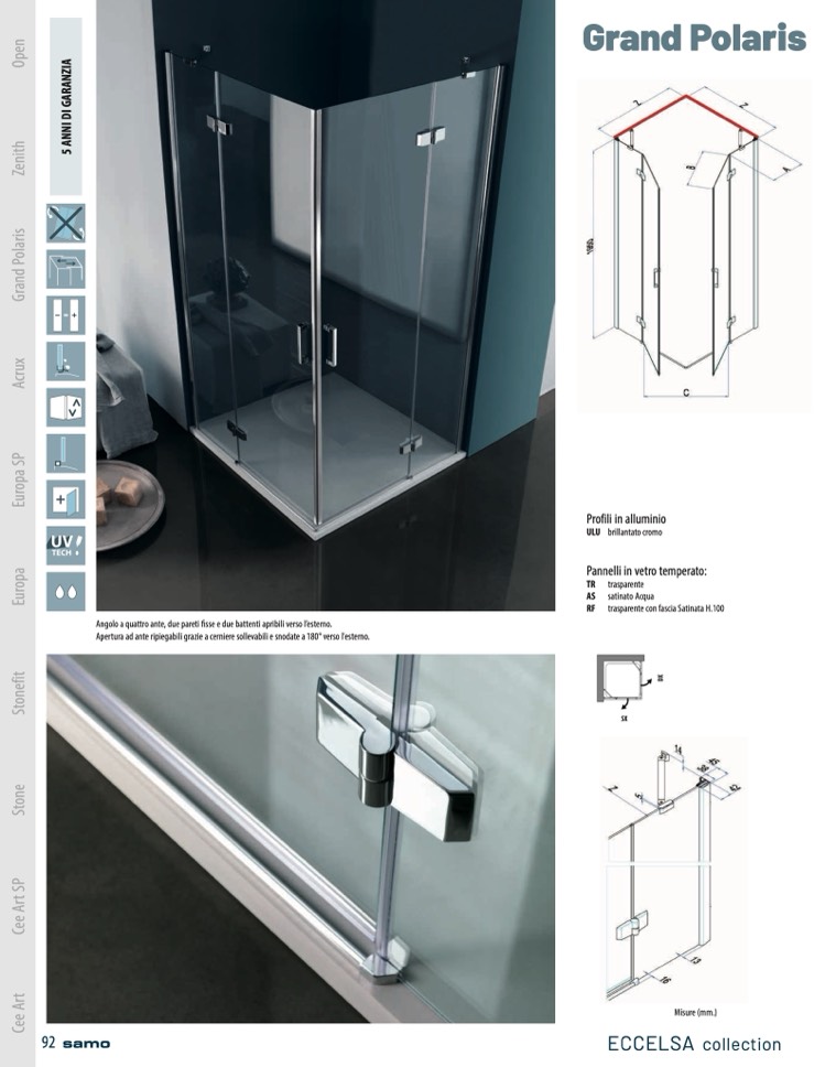 Angolo a quattro ante, due pareti fisse e due battenti apribili verso l’esterno.