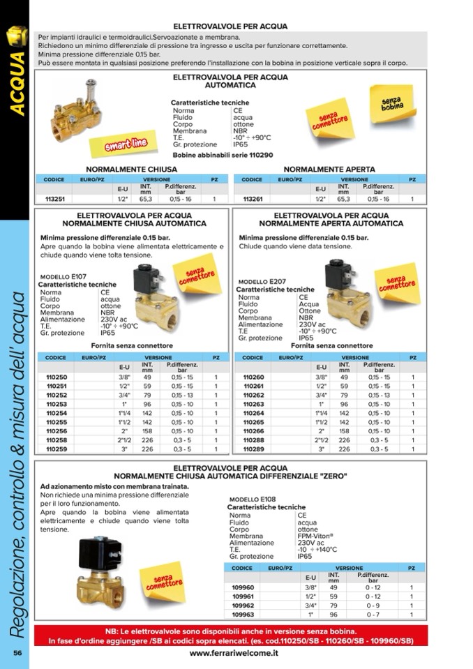 NB: Le elettrovalvole sono disponibili anche in versione senza bobina.