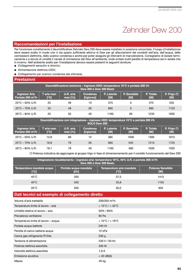 (*) Potenza indicativa da aggiungere al gruppo frigo in fase di dimensionamento per il corretto funzionamento del Dew 200