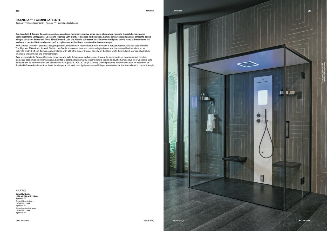 190x120 cm (h. 214 cm). Gemini can be installed with all Hafro shower trays or directly on the