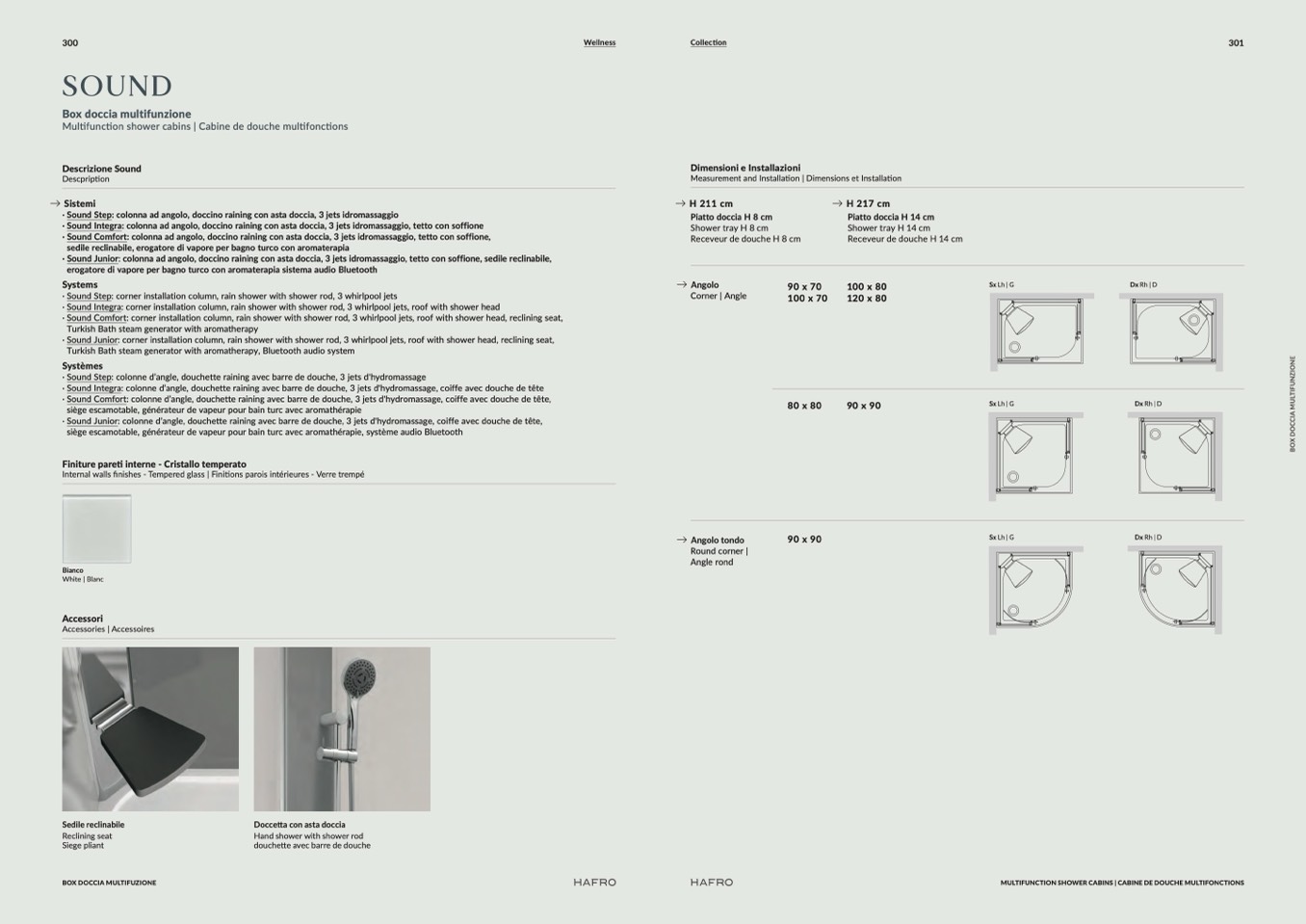 ∙ Sound Comfort: colonne d’angle, douchette raining avec barre de douche, 3 jets d'hydromassage, coiffe avec douche de t