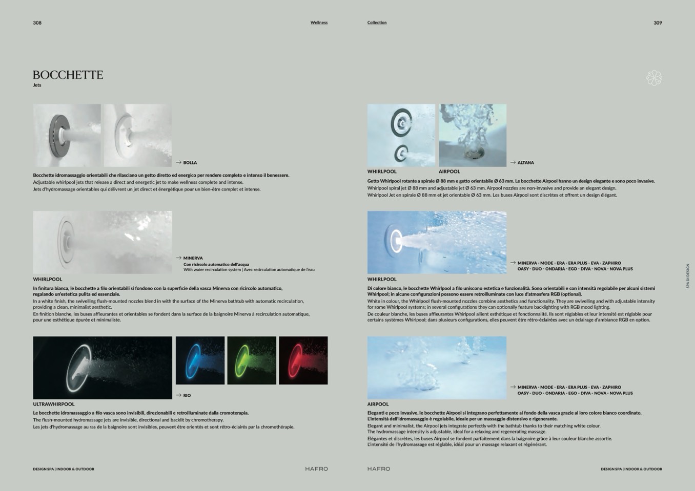 flush-mounted nozzles combine aesthetics and functionality. They are swivelling and with adjustable intensity