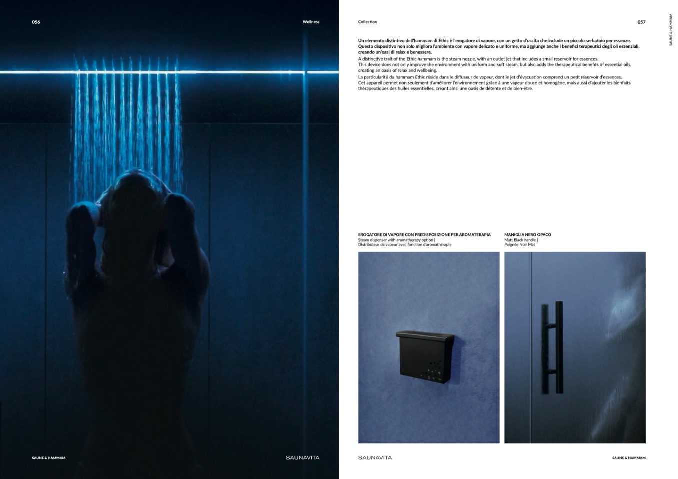 tinctive trait of the Ethic hammam is the steam nozzle, with an outlet jet that includes a small reservoir for essences.