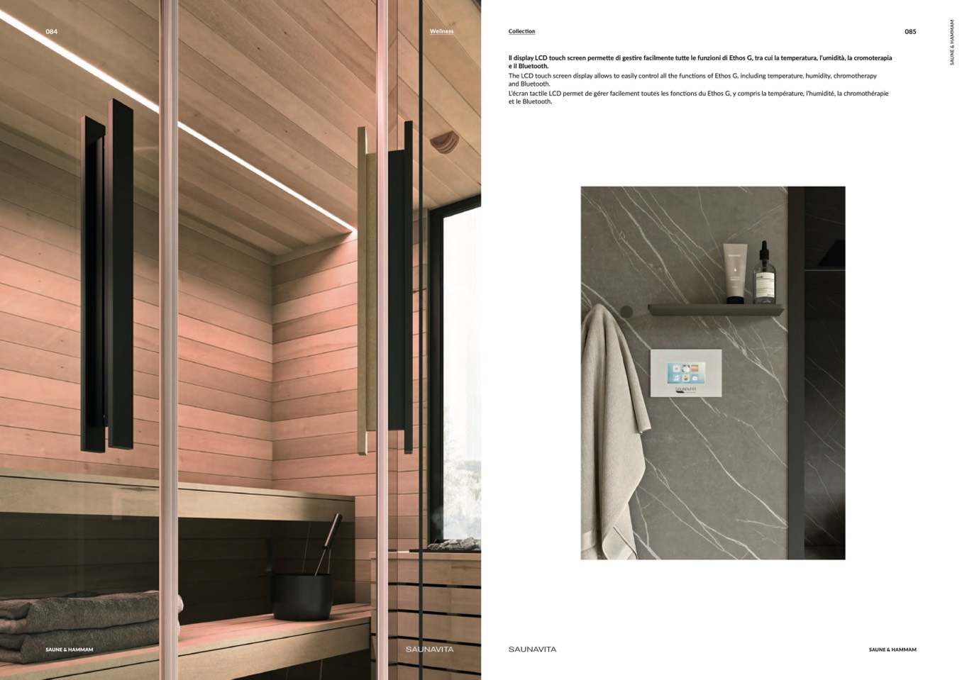 écran tactile LCD permet de gérer facilement toutes les fonctions du Ethos G, y compris la température, l’humidité, la chromothérapie