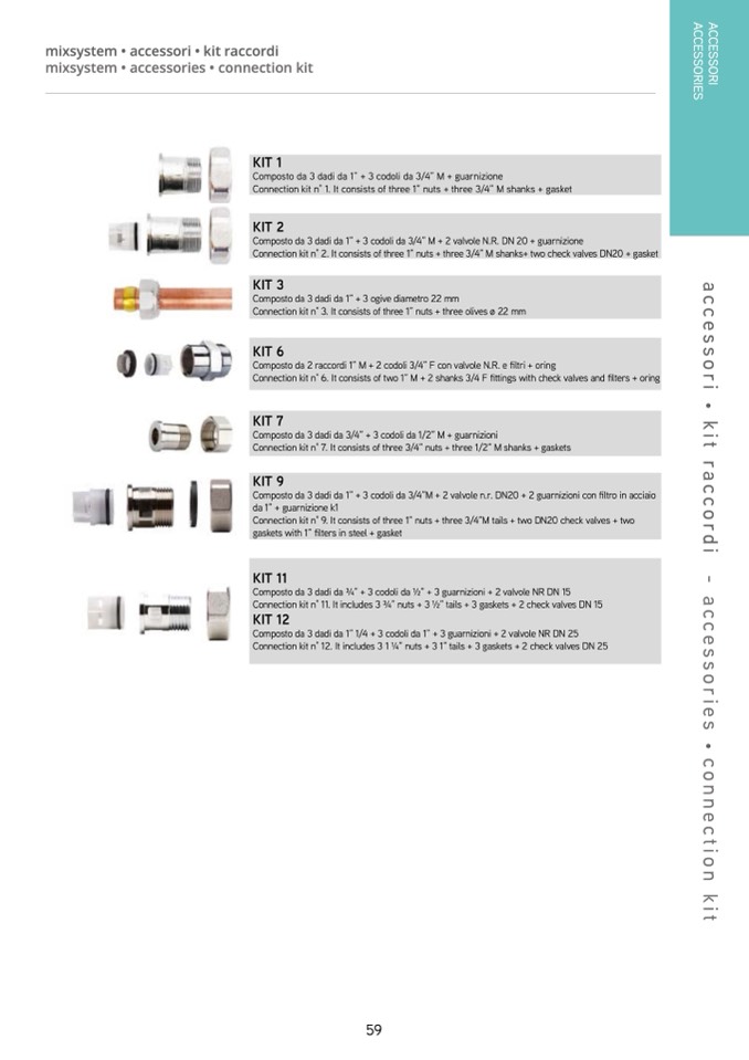 Connection kit n° 11. It includes 3 ¾” nuts + 3 ½” tails + 3 gaskets + 2 check valves DN 1