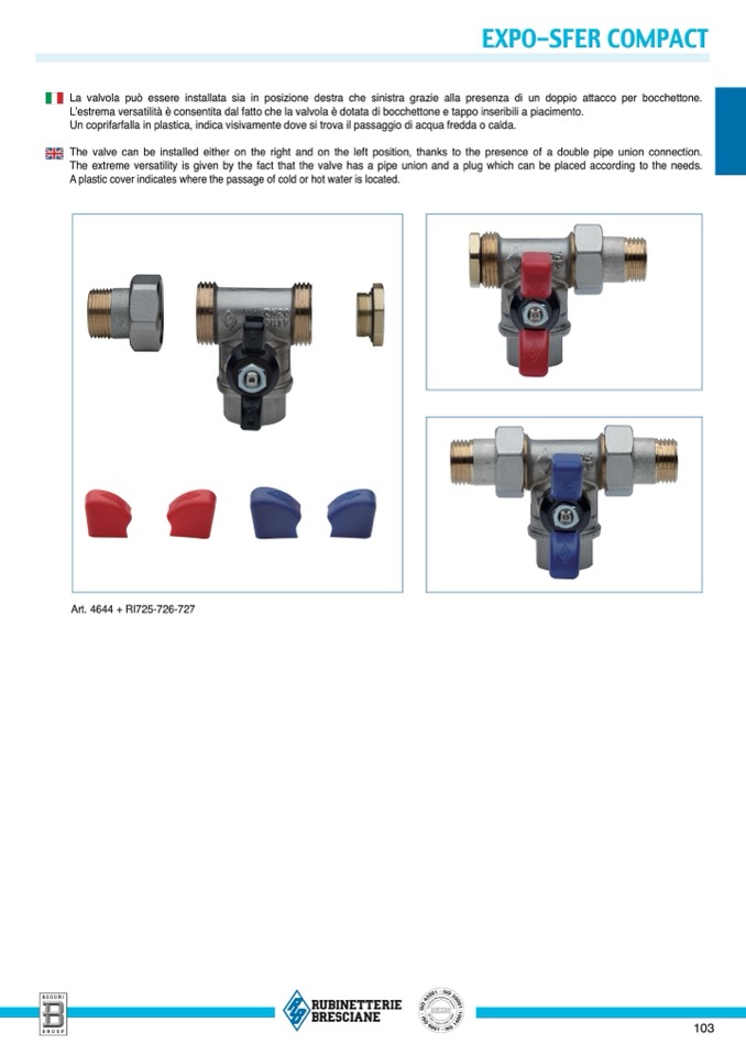 The valve can be installed either on the right and on the left position, thanks to the presence of a double pipe union connection.