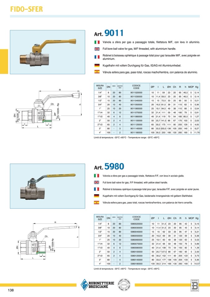 Valvola a sfera per gas a passaggio totale, filettatura M/F, con leva in alluminio.
