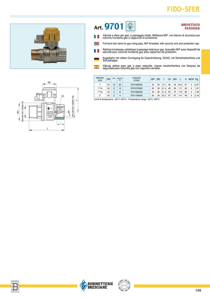Full bore ball valve for gas rising pipe, M/F threaded, with security lock and protection cap.