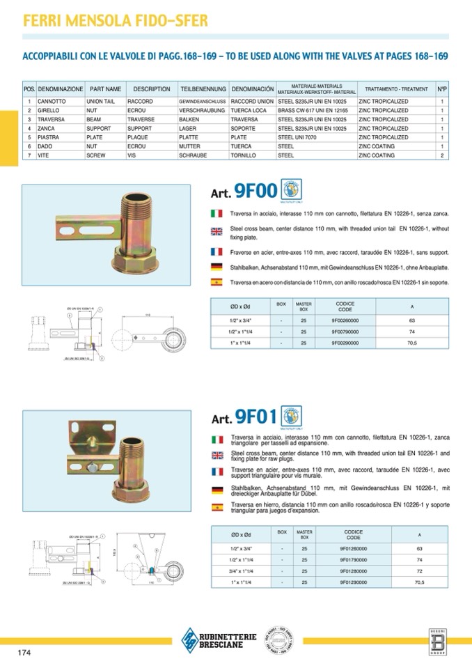 Traversa in acciaio, interasse 110 mm con cannotto, filettatura EN 10226-1, zanca