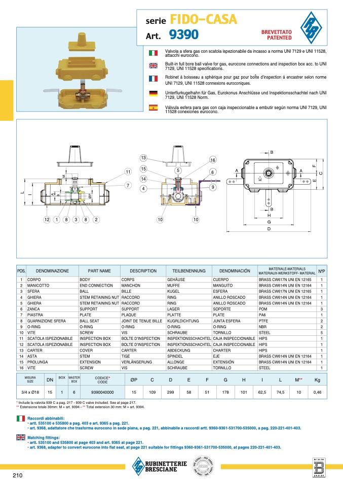 Válvula esfera para gas con caja inspeccionable a embutir según norma UNI 7129, UNI