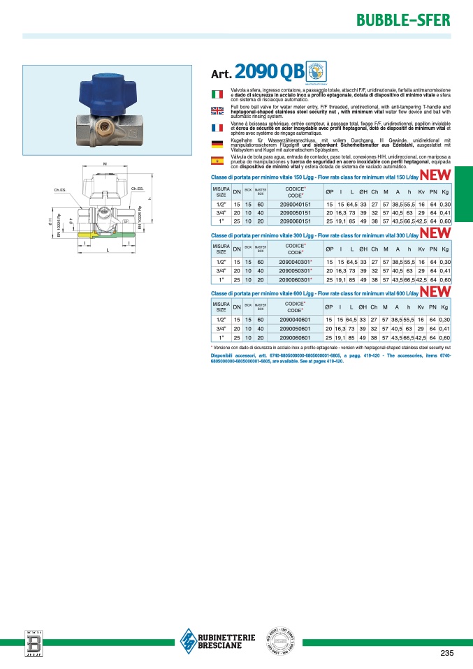 Valvola a sfera, ingresso contatore, a passaggio totale, attacchi F/F, unidirezionale, farfalla antimanomissione