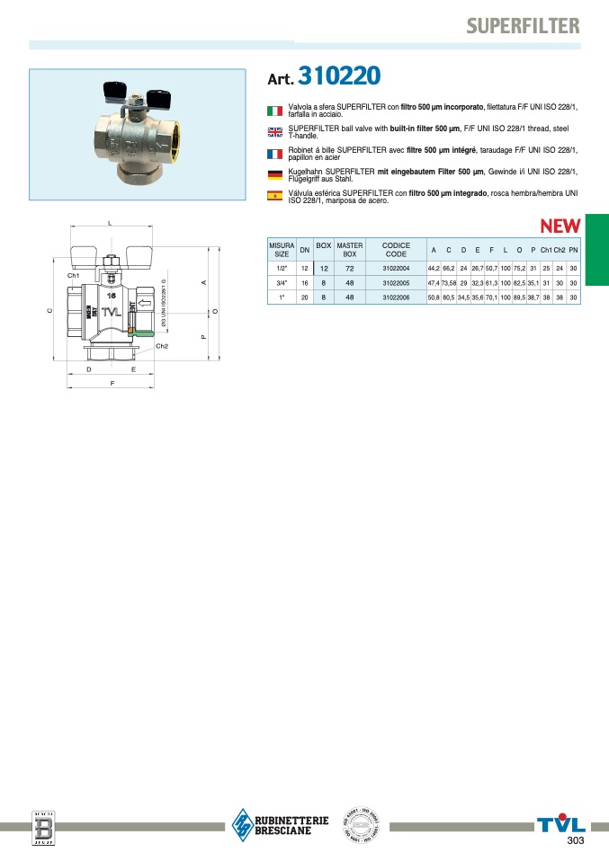 Kugelhahn SUPERFILTER mit eingebautem Filter 500 µm, Gewinde i/i UNI ISO 228/1