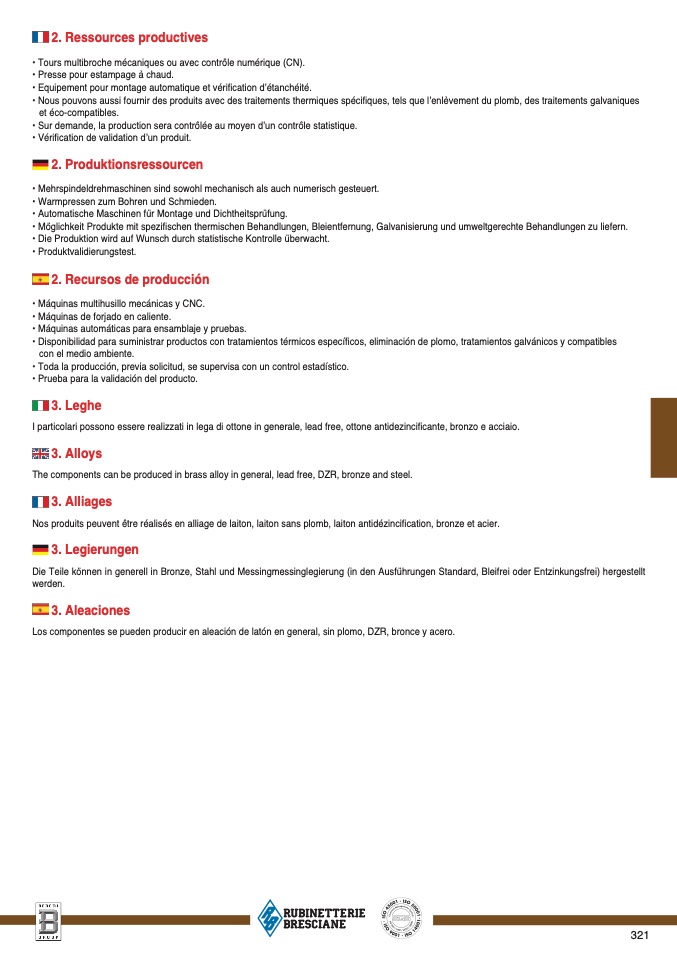 Los componentes se pueden producir en aleación de latón en general, sin plomo, DZR, bronce y acero