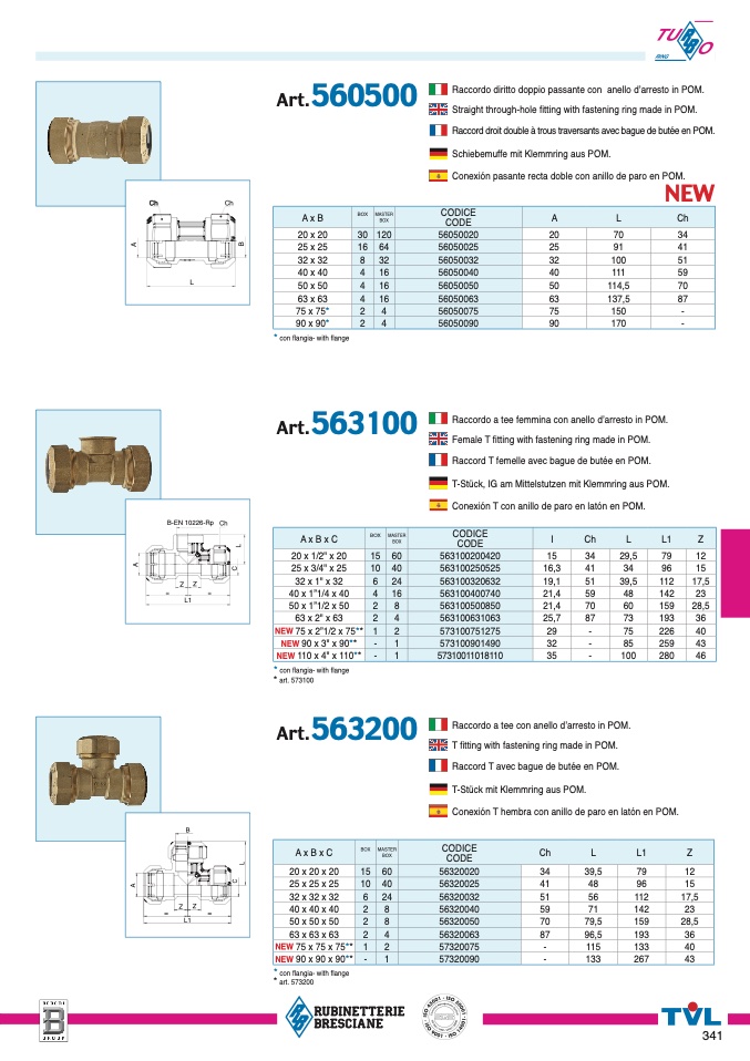 Conexión T hembra con anillo de paro en latón en POM