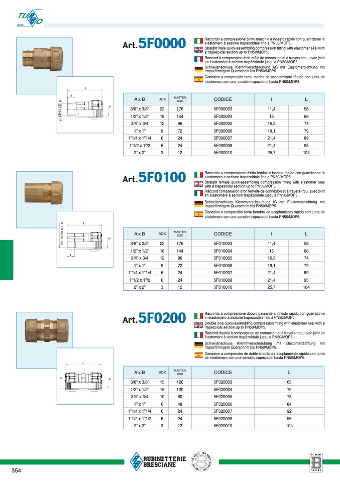Raccordo a compressione diritto femina a innesto rapido con guarnizione in