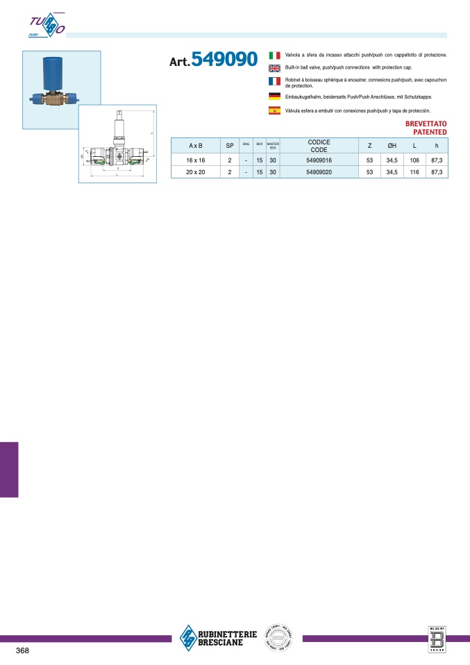 Valvola a sfera da incasso attacchi push/push con cappellotto di protezione.