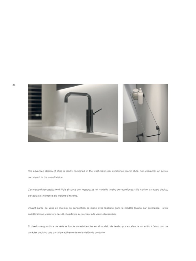 The advanced design of Velis is lightly combined in the wash basin par excellence: iconic style, firm character, an active