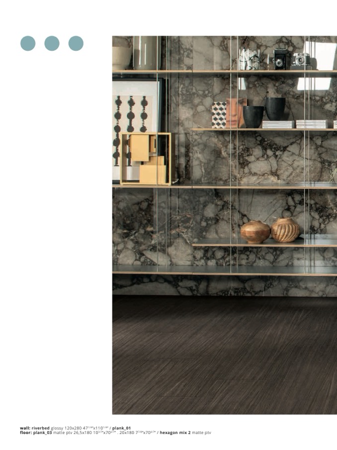 floor: plank_03 matte ptv 26,5x180 103/7”x706/7” . 20x180 77/8”x706/7” / hexagon mix 2 matte ptv