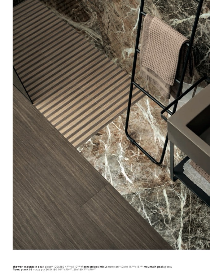 shower: mountain peak glossy 120x280 471/4”x1101/4” floor: stripes mix 2 matte ptv 40x40 153/4”x153/4” mountain peak glossy