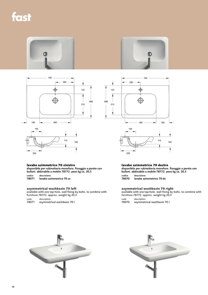 lavabo asimmetrico 70 dx
