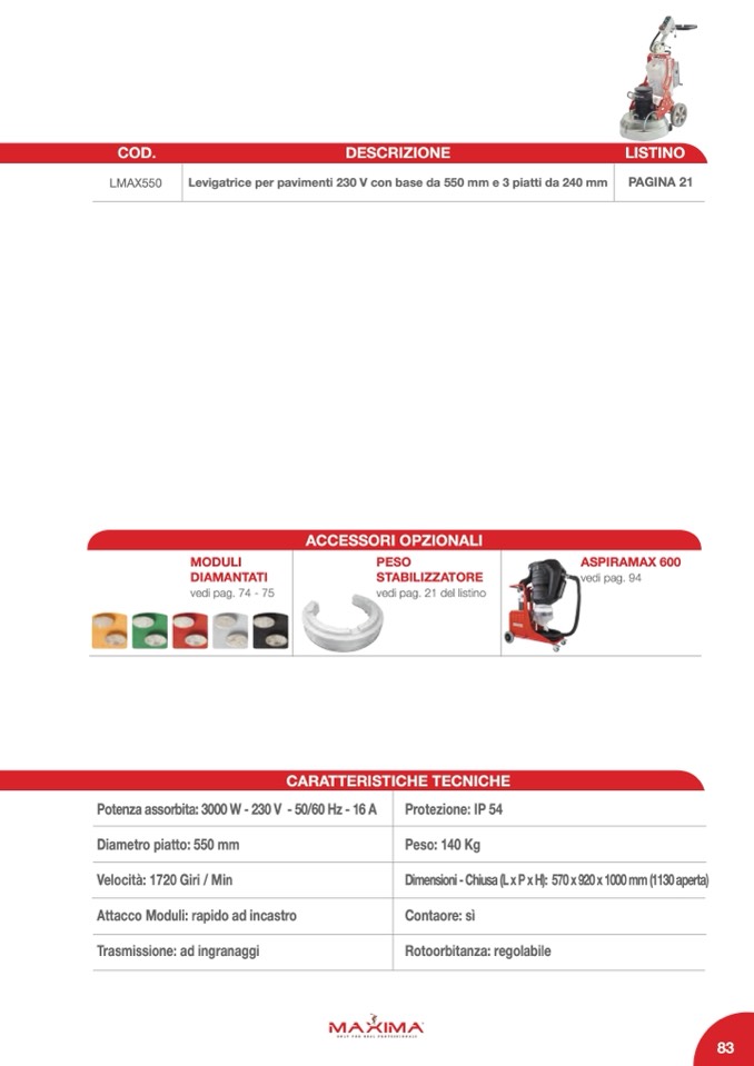 Levigatrice per pavimenti 230 V con base da 550 mm e 3 piatti da 240 mm