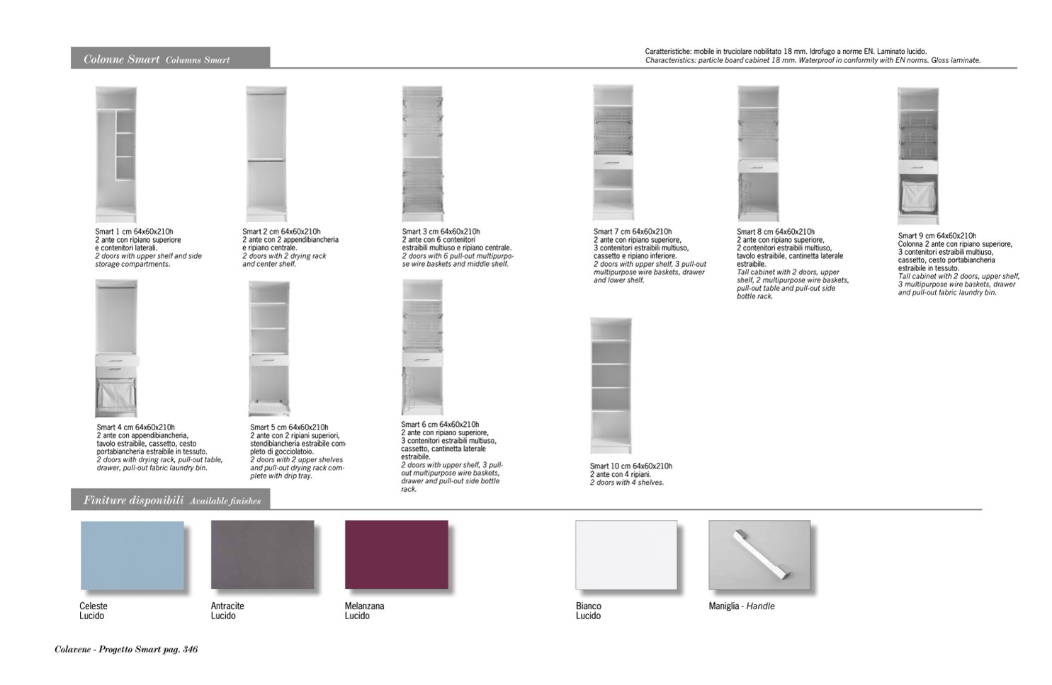 Characteristics: particle board cabinet 18 mm. Waterproof in conformity with EN norms. Gloss laminate.