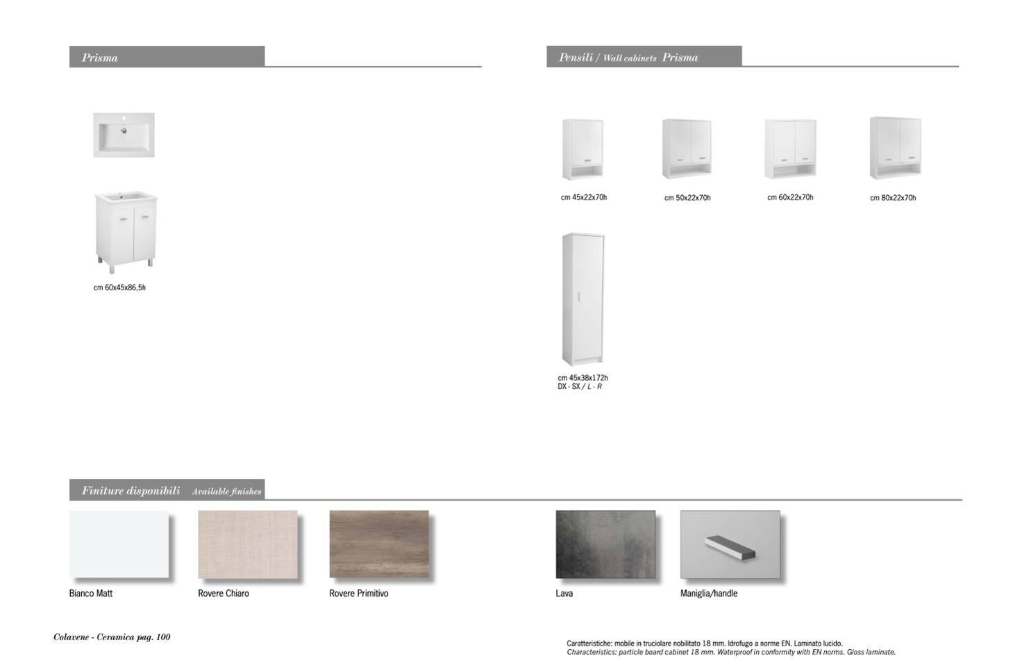 Characteristics: particle board cabinet 18 mm. Waterproof in conformity with EN norms. Gloss laminate.