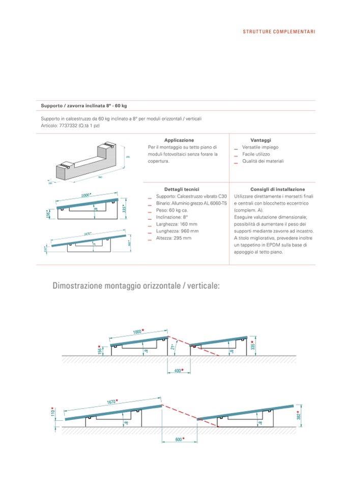 Supporto in calcestruzzo da 60 kg inclinato a 8° per moduli orizzontali / verticali
