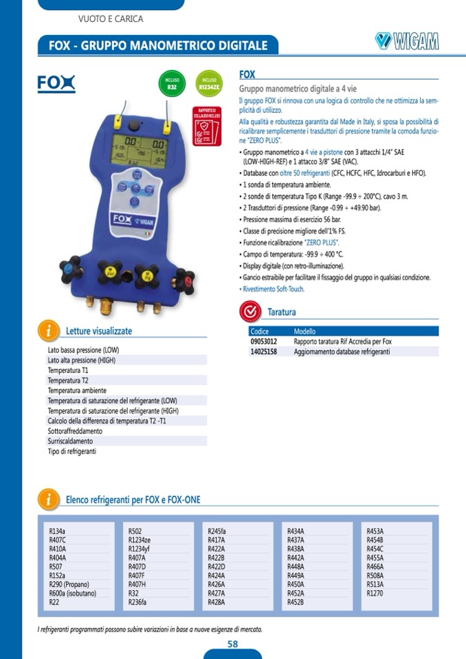 • Database con oltre 50 refrigeranti (CFC, HCFC, HFC, Idrocarburi e HFO).