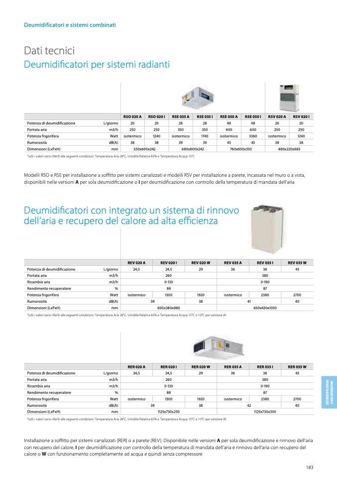 Installazione a soffitto per sistemi canalizzati (RER) o a parete (REV). Disponibile nelle versioni A per sola deumidificazione e rinnovo dell’aria