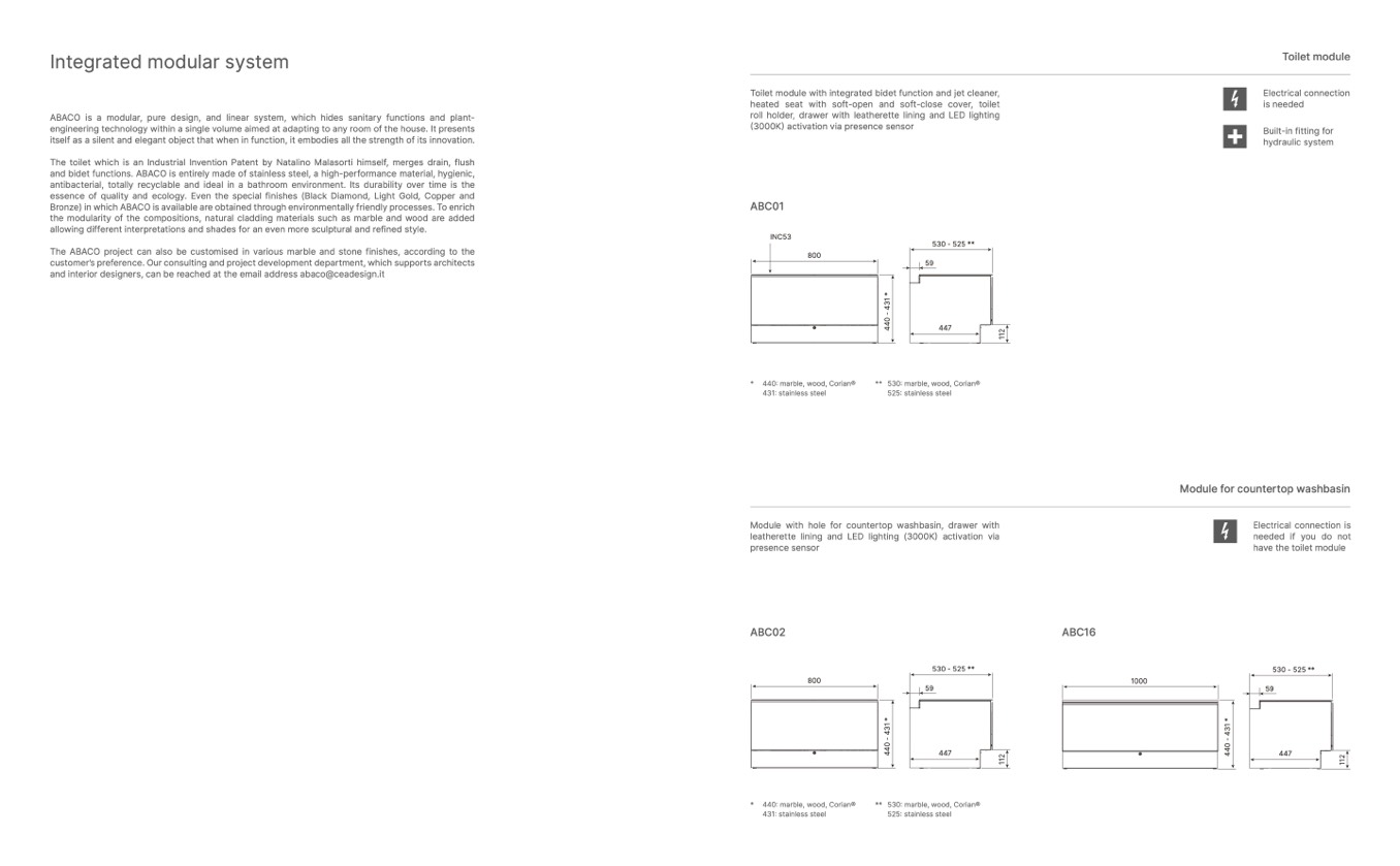 ABACO is a modular, pure design, and linear system, which hides sanitary functions and plant-