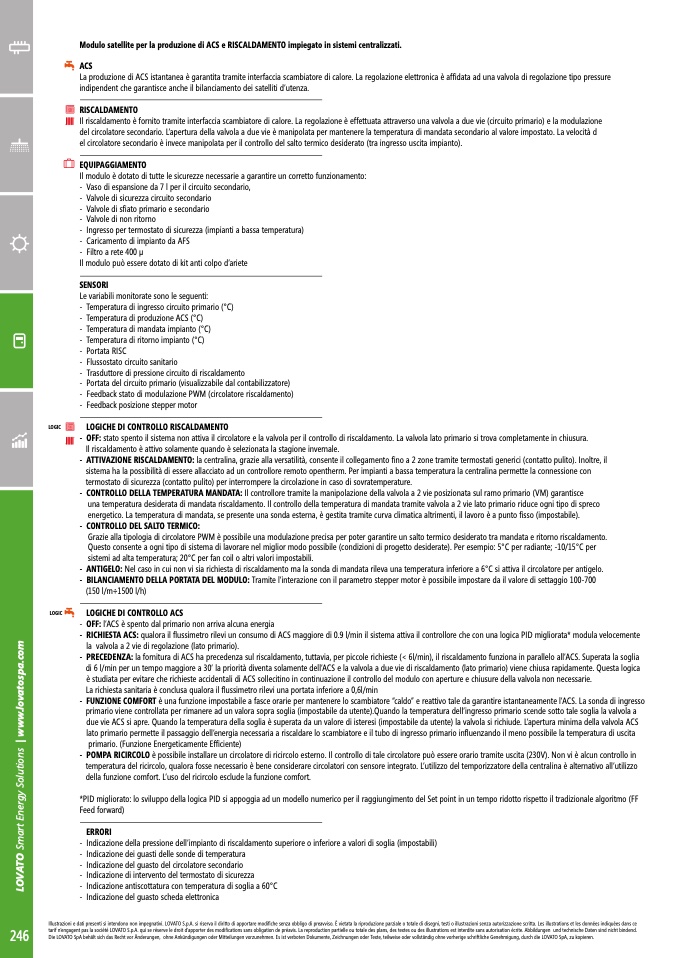 La produzione di ACS istantanea è garantita tramite interfaccia scambiatore di calore. La regolazione elettronica è affidata ad una valvola di regolazione tipo pressure