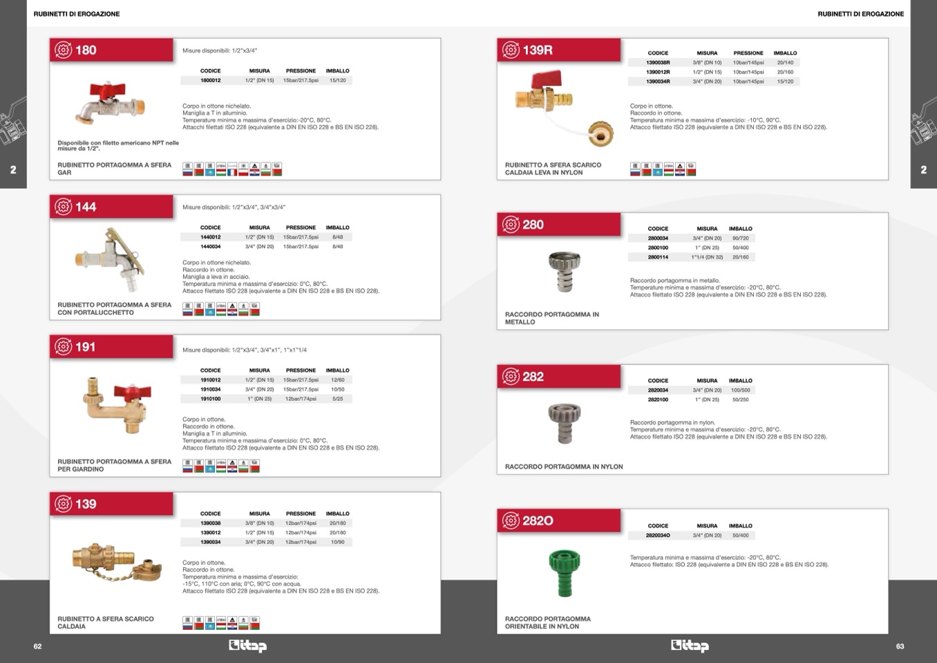 filettato: ISO 228 (equivalente a DIN EN ISO 228 e BS EN ISO 228).