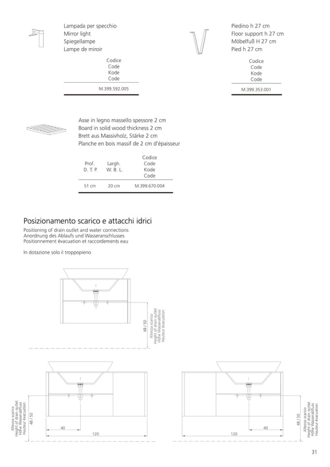 Positioning of drain outlet and water connections