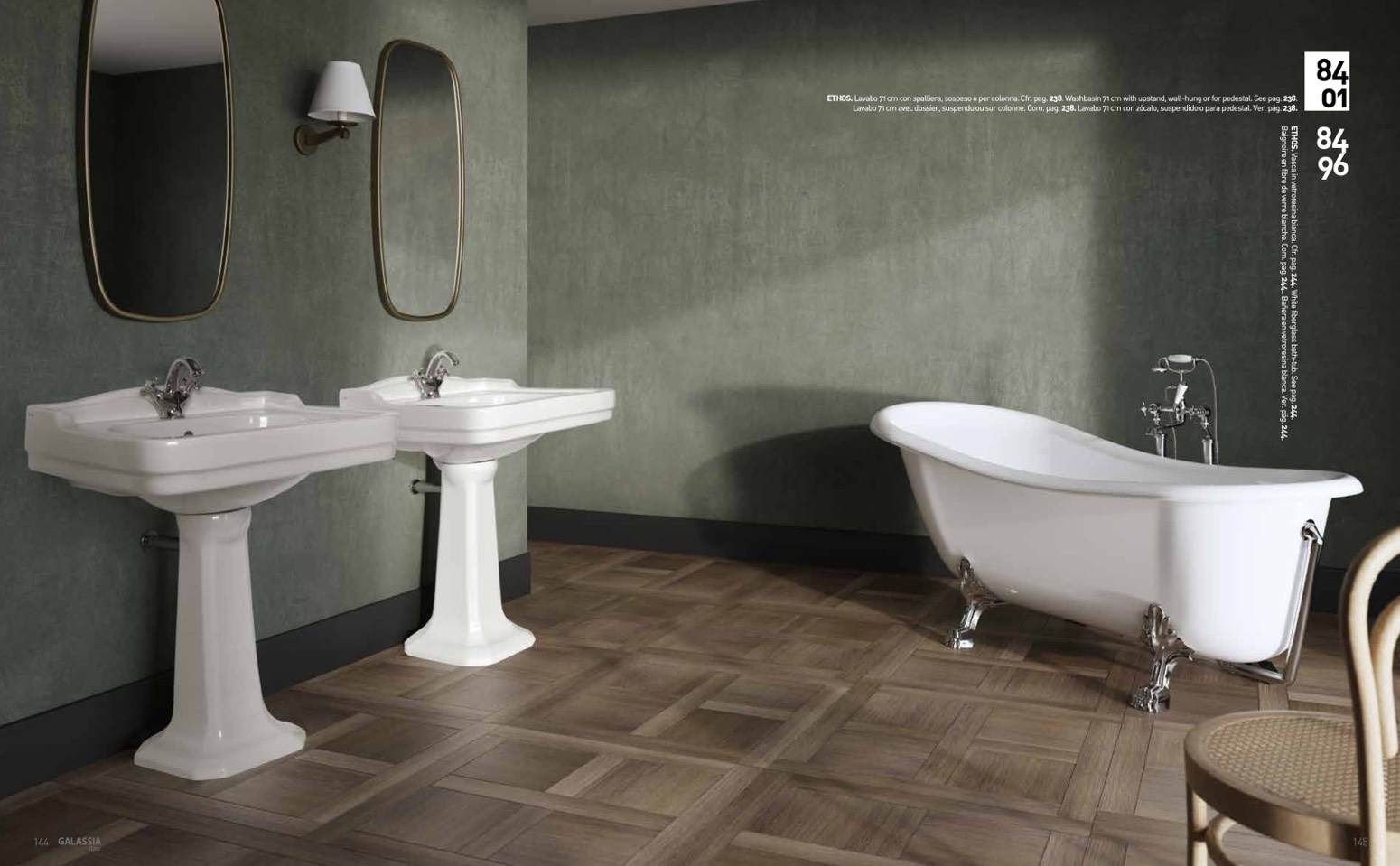 ETHOS. Lavabo 71 cm con spalliera, sospeso o per colonna. Cfr. pag. 238. Washbasin 71 cm with upstand, wall-hung or for pedestal. See pag. 238.