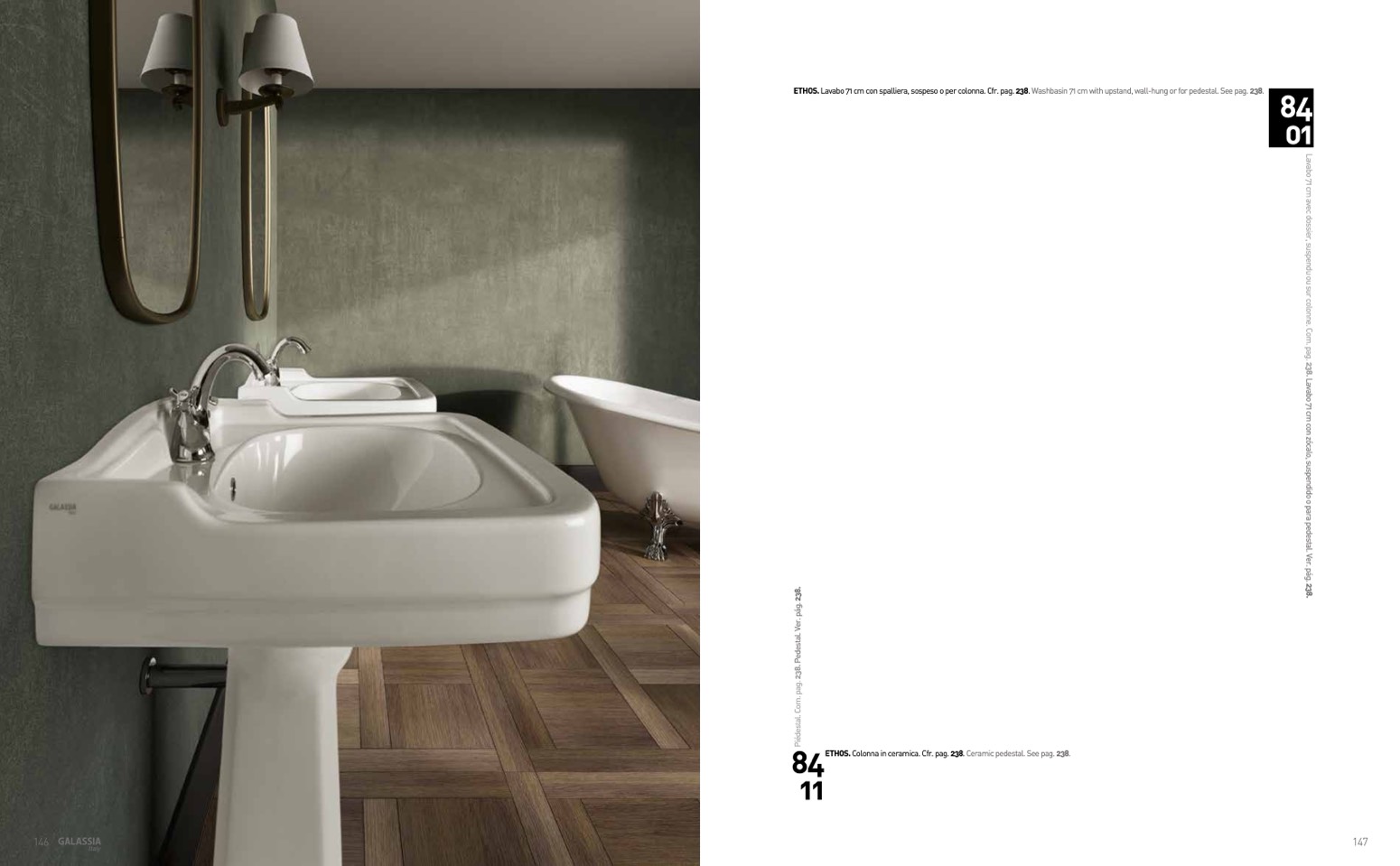 ETHOS. Lavabo 71 cm con spalliera, sospeso o per colonna. Cfr. pag. 238. Washbasin 71 cm with upstand, wall-hung or for pedestal. See pag. 238.