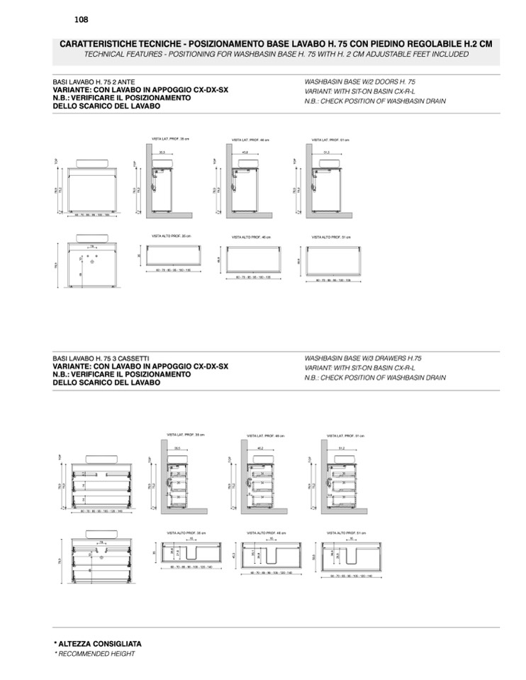 TECHNICAL FEATURES - POSITIONING FOR WASHBASIN BASE H. 75 WITH H. 2 CM ADJUSTABLE FEET INCLUDED