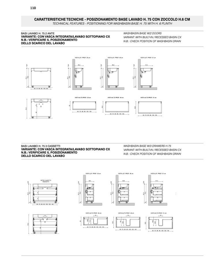 TECHNICAL FEATURES - POSITIONING FOR WASHBASIN BASE H. 75 WITH H. 6 PLINTH